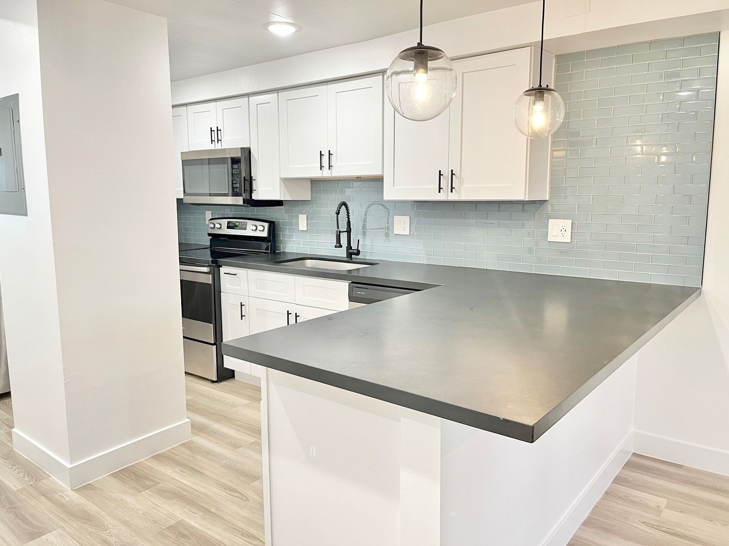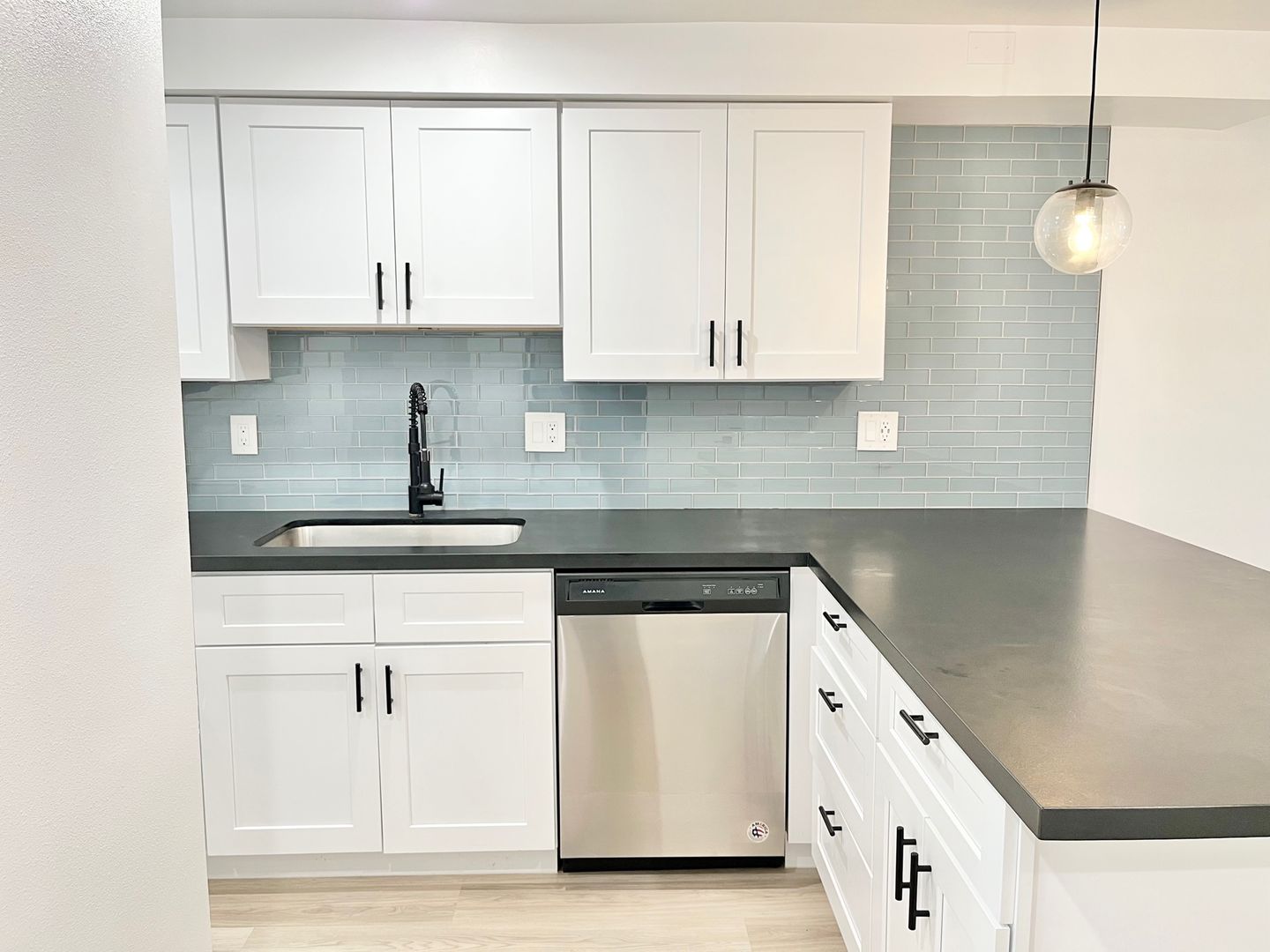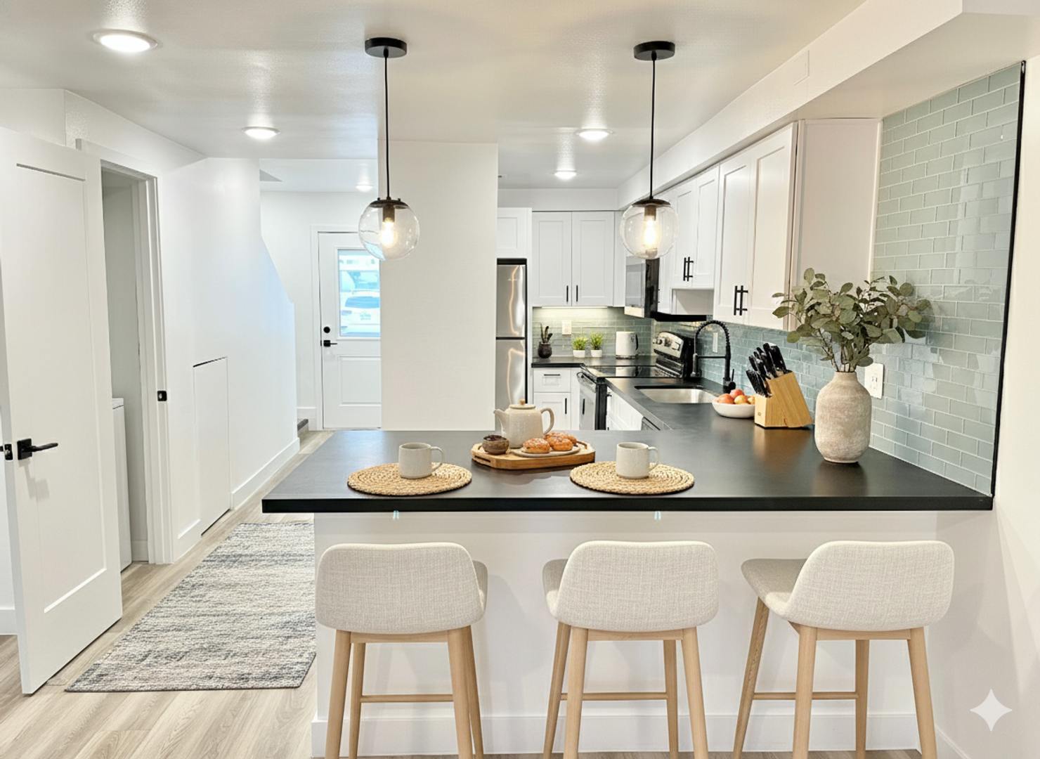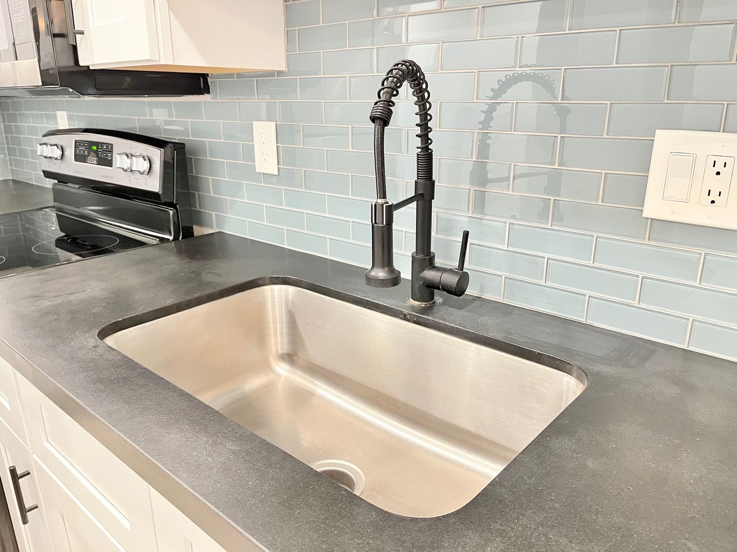 -Modern cabinetry & chic aquatic backsplash