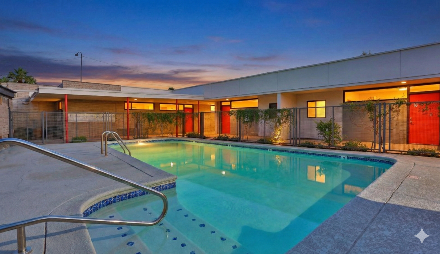 This property boasts a sparkling pool, off-street covered parking, front patios, mature greenery in the courtyard, and excellent mid-century modern aesthetics.