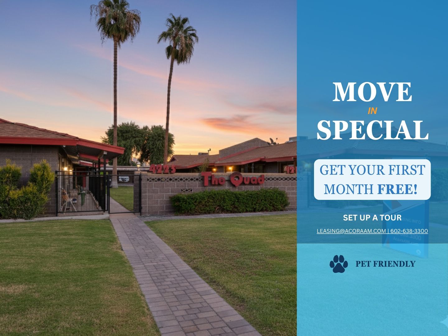 The Quad is a beautifully upgraded, single-level 8-unit garden-style community in the Biltmore District—just seconds to Biltmore Fashion Park and the SR-51/Piestewa Freeway. Located at 26th St & Devonshire, you’re moments from The Original Chop Shop, Noble Eatery, the Camelback Colonnade, the Biltmore Country Club and more.