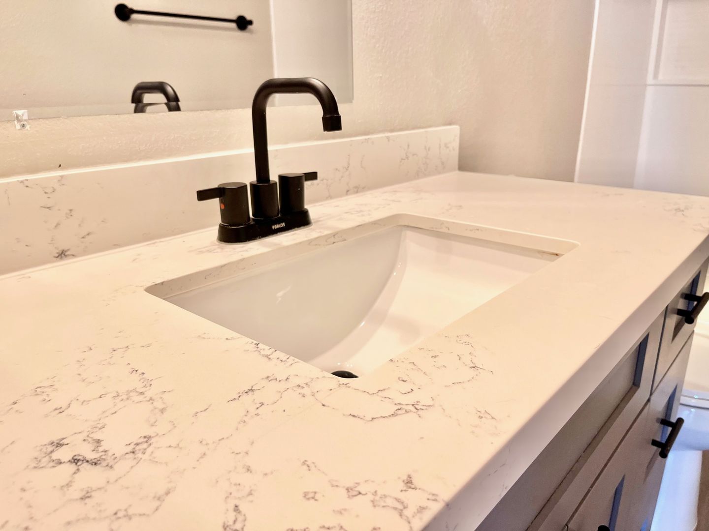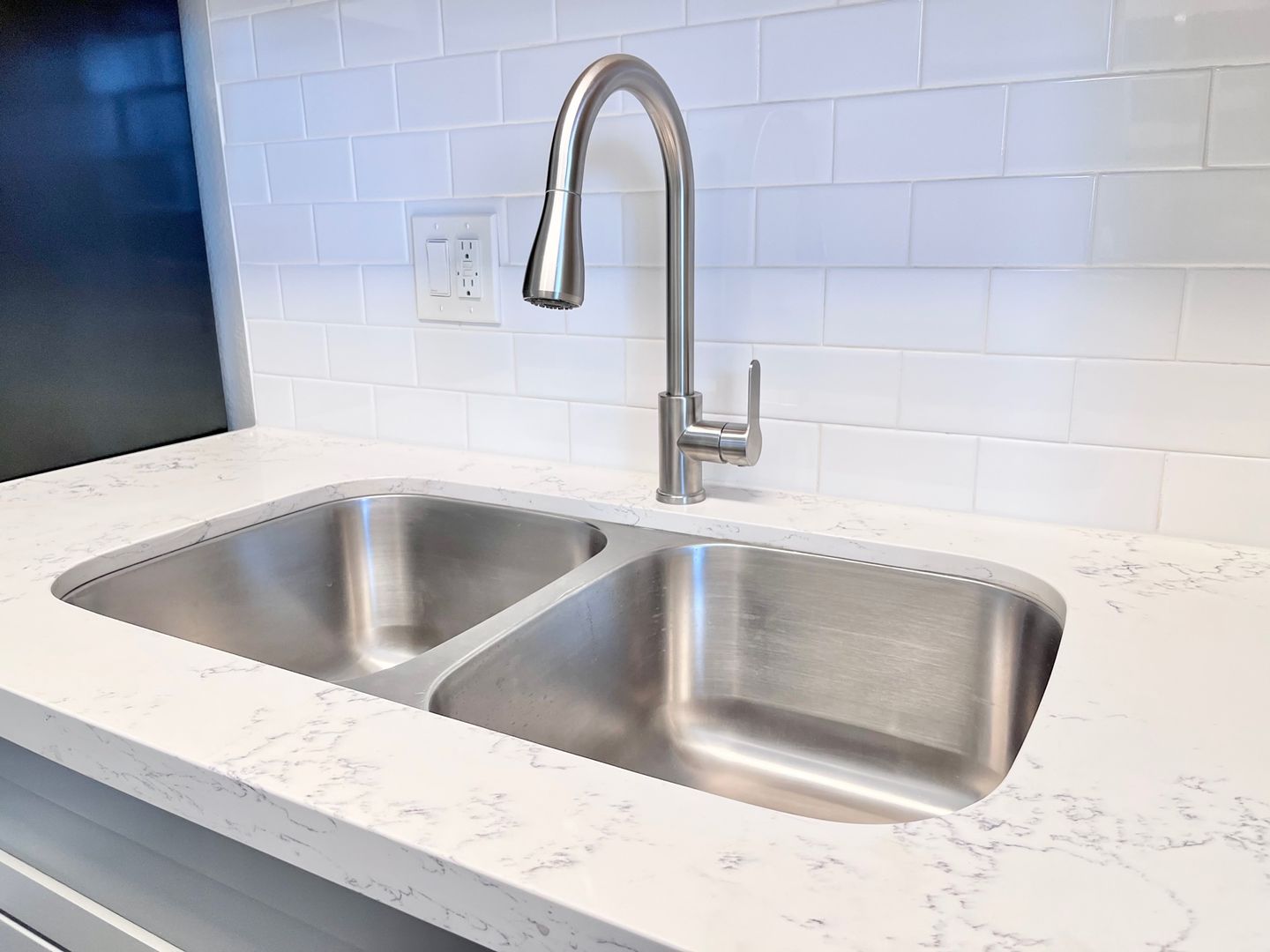 -Revamped kitchen with new cabinets, quartz counters, and stylish backsplash