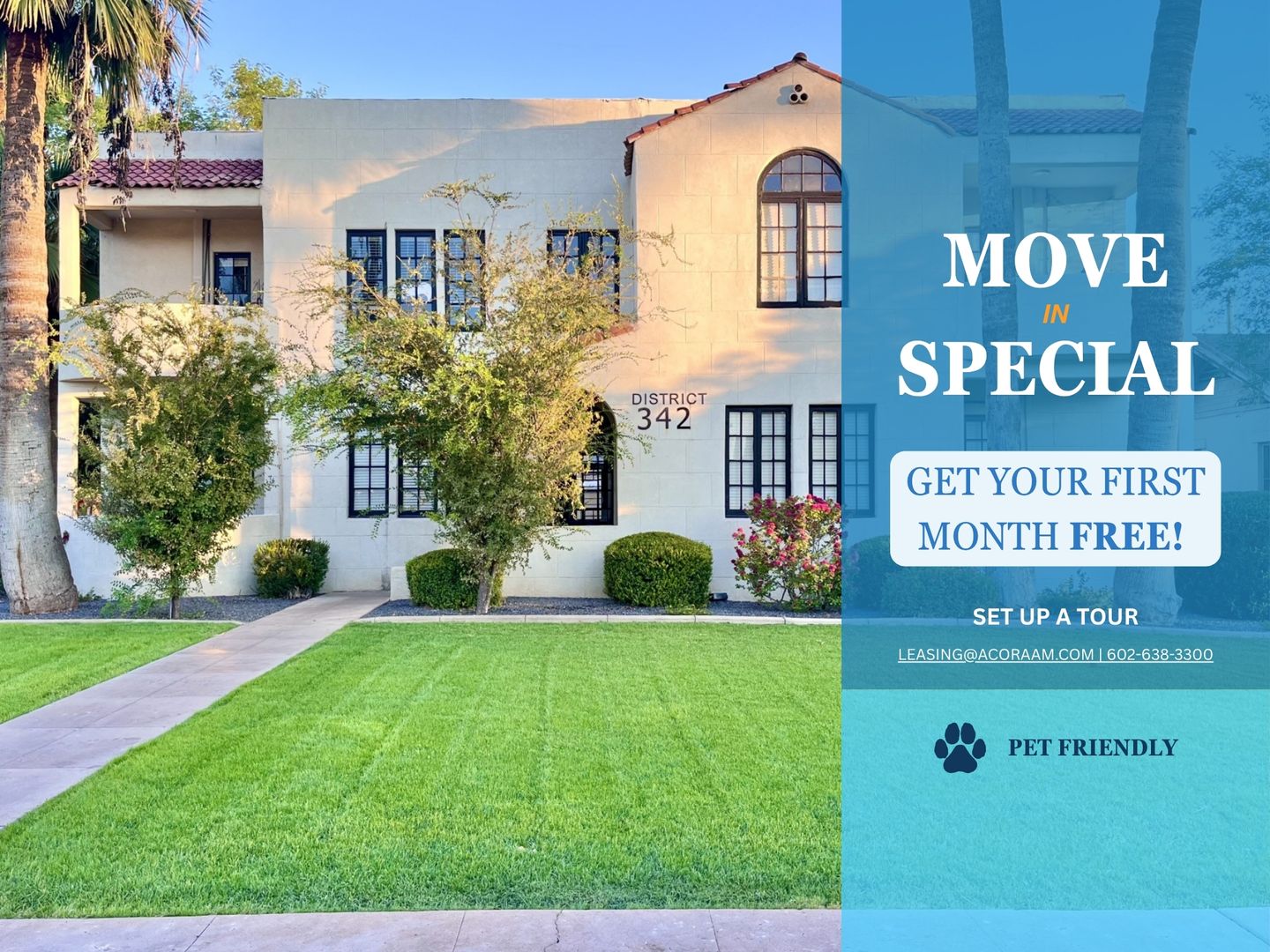 District 342 is a beautiful property with unmatched charm built just after the turn of the century. Lots of natural light and a balcony with unbeatable views of Downtown Phoenix, make District 342 a one of a kind place to call home. The residence has an in-unit washer/dryer.