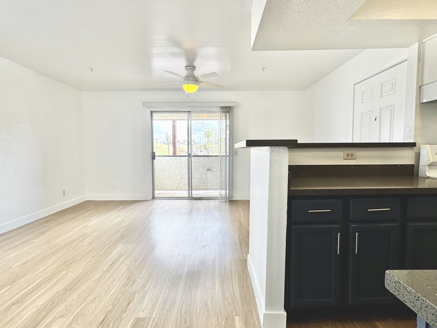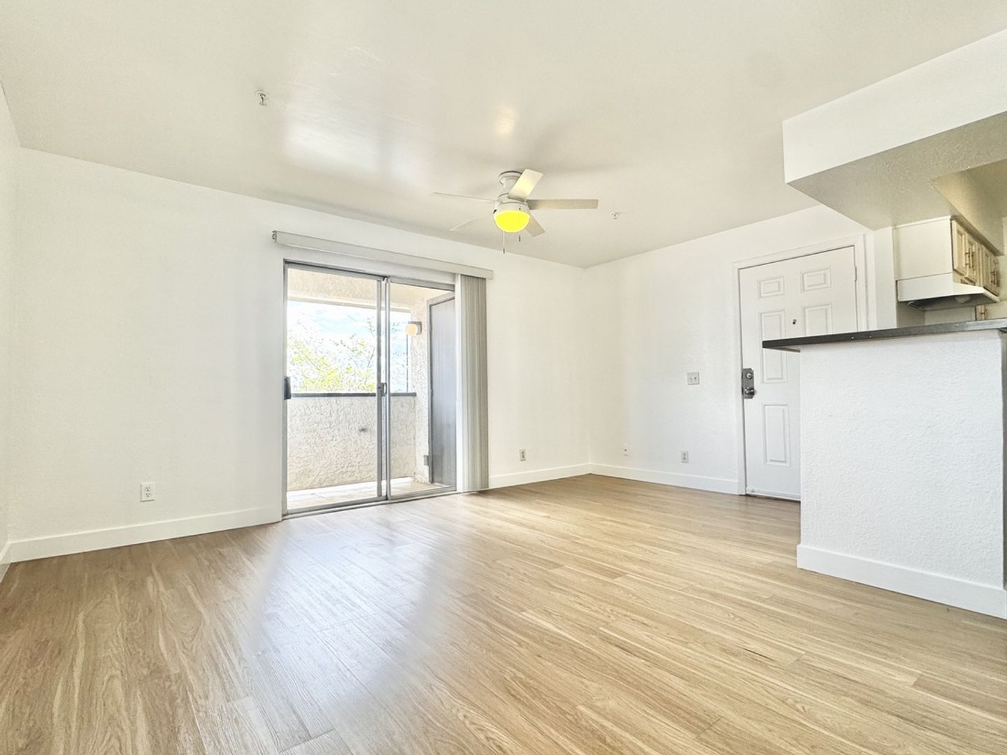 -Sliding glass doors leading to a private patio/balcony with a storage closet