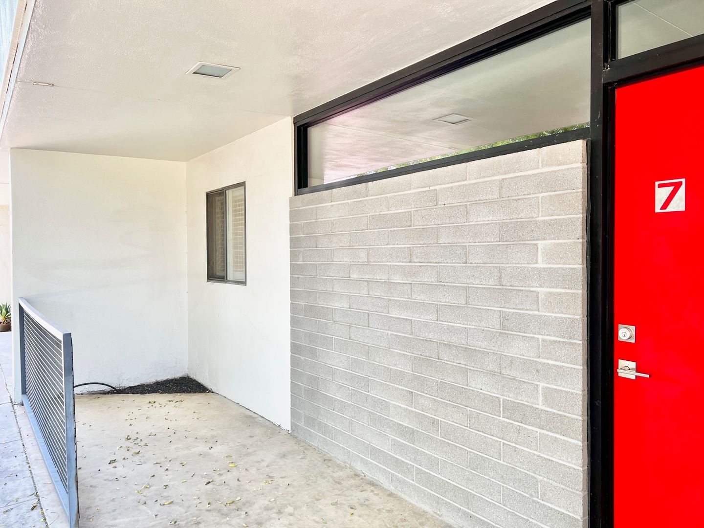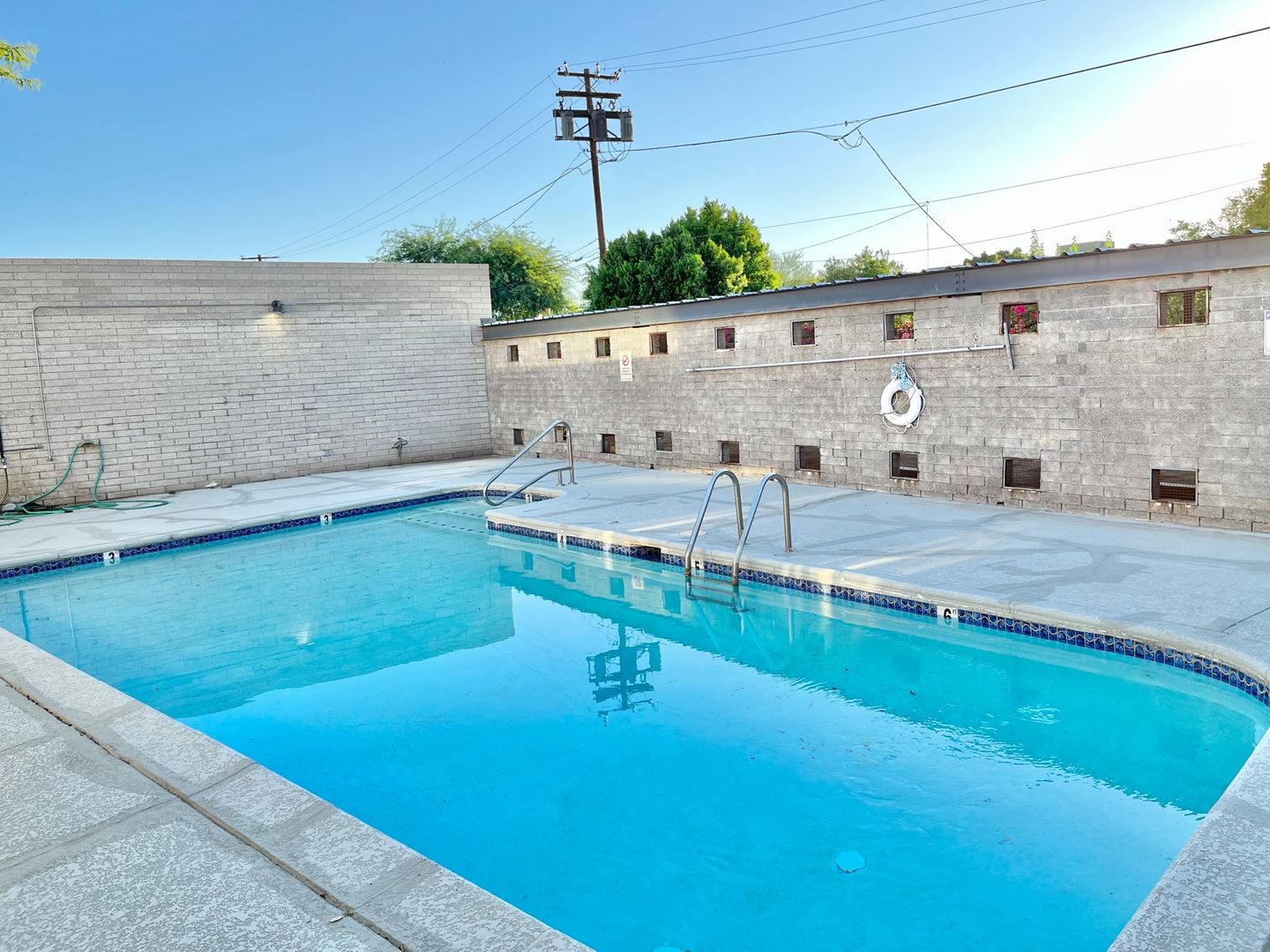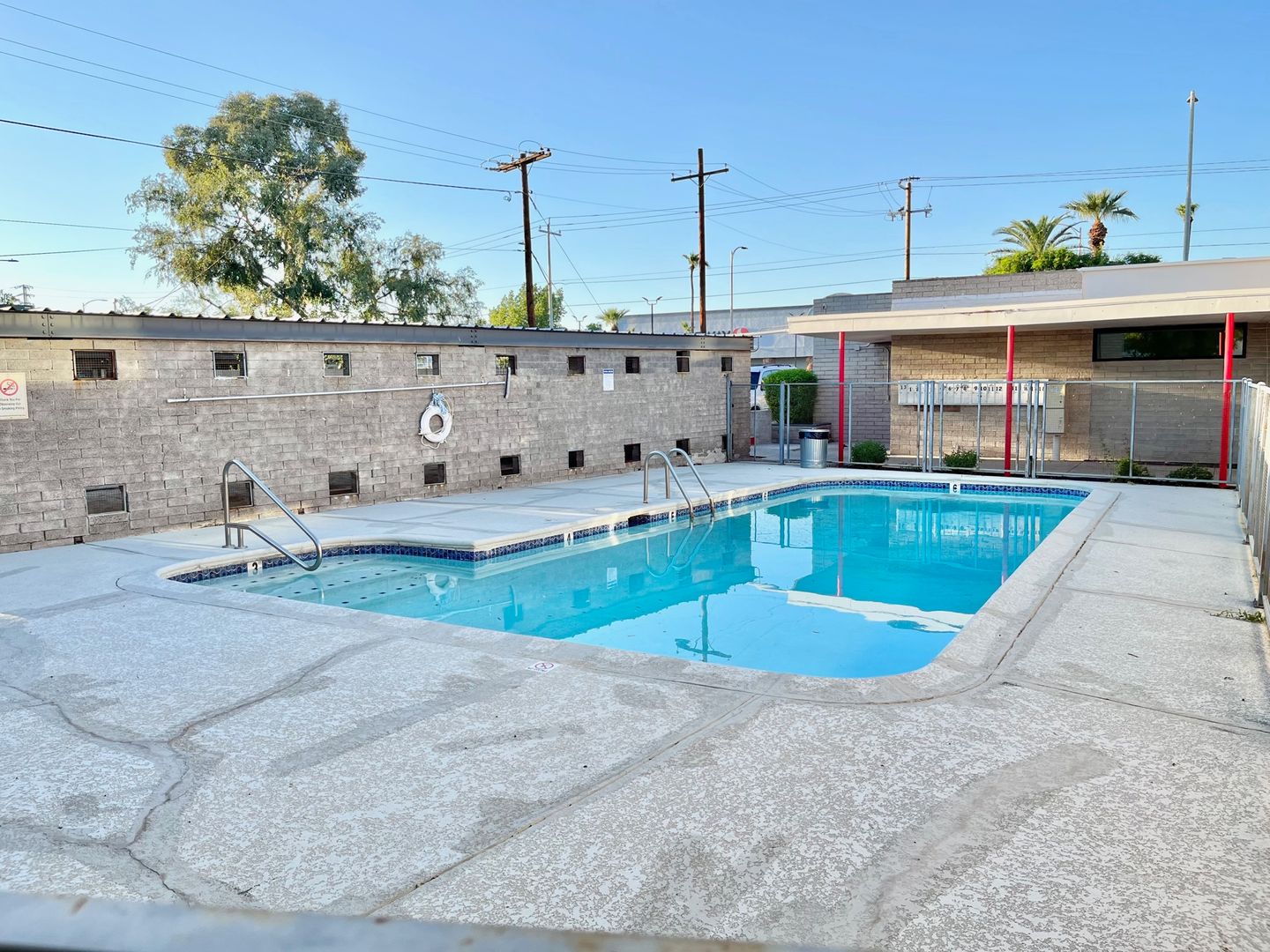 This property boasts a sparkling pool, off-street covered parking, front patios, mature greenery in the courtyard, and excellent mid-century modern aesthetics.